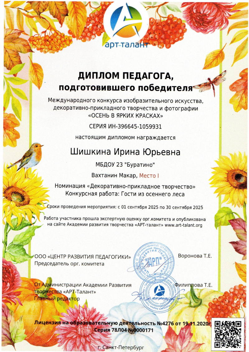Диплом педагога подготовившего победителя Международного конкурса изобразительног искусства, декоративно- прикладного творчества и фотографии "ОСЕНЬ В ЯРКИХ КРАСКАХ" за 1 место Вахтанин Макар