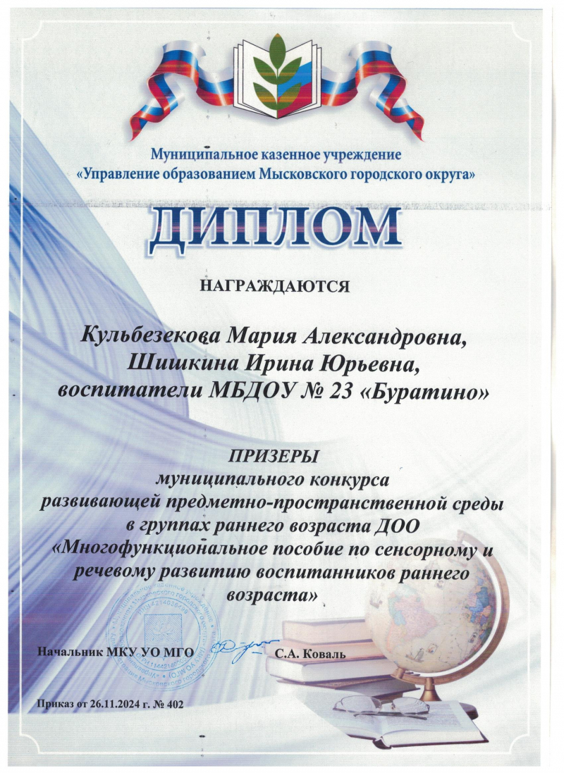 Диплом Муниципального конкурса развивающей предметно-пространственной среды в группах раннего возраста ДОО "Многофункциональное пособие по сенсорному и речевому развитию воспитанников  раннего возраста".